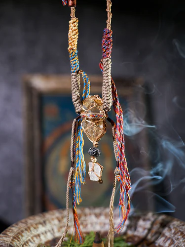 The Guardian Threads Crystal Necklace blends rustic charm with spiritual energy, featuring a hand-woven cotton cord adorned with pure silver accents and an intricately wrapped white crystal centerpiece. This design symbolizes protection and fortune, aligning with Kailash Energy’s mission to create meaningful, energy-infused jewelry. Each strand represents a connection to positive forces, while the crystal enhances clarity and wards off negativity.